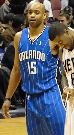 On June 25, 2009, Carter was traded, along with Ryan Anderson, to the Orlando Magic in exchange for Rafer Alston, Tony Battie and Courtney Lee.[61] Orlando hoped Carter would provide center Dwight Howard with a perimeter scorer who can create his own shot—something the Magic had lacked when they were defeated in the 2009 NBA Finals by the Los Angeles Lakers.[62] On February 8, 2010, Carter had a season-high 48 points, 34 in the second half, when the Magic rallied from a 17-point deficit to defeat the New Orleans Hornets 123–117.[63] Carter helped the Magic reach the Eastern Conference Finals, where they were defeated 4–2 by the Boston Celtics.