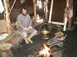 Newfoundland marine insurance agent and historian William A. Munn (1864–1939), after studying literary sources in Europe, suggested in his 1914 book Location of Helluland, Markland & Vinland from the Icelandic Sagas that the Vinland explorers "went ashore at Lancey [sic] Meadows, as it is called to-day".[38] In 1960, the remains of a small Norse encampment[7] were discovered by Helge and Anne Stine Ingstad at that exact spot, L'Anse aux Meadows in northern Newfoundland, and excavated during the 1960s and 1970s. It is most likely this was the main settlement of the sagas, a "gateway" for the Norse Greenlanders to the rich lands farther south. Many wooden objects were found at L'Anse aux Meadows, and radiocarbon dating confirms the site's occupation as being confined to a short period around 1000 CE. In addition, small pieces of jasper, known to have been used in the Norse world as fire-strikers, were found in and around the different buildings. When these were analyzed and compared with samples from jasper sources around the North Atlantic area, it was found that two buildings contained only Icelandic jasper pieces, while another contained some from Greenland; a single piece from the east coast of Newfoundland was found. These finds appear to confirm the saga claim that some Vinland exploration ships came from Iceland and that they ventured down the east coast of the new land.[39] In 2021, wood from the site was shown to have been cut in 1021, using metal blades, which the local Indigenous people did not have.[40]