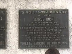 When Chamorro was elected, President George H. W. Bush removed the embargo that President Ronald Reagan had imposed during Sandinista rule and promised economic aid to the country.[71] In addition, the United States paid off the past-due debts of Nicaragua that were owed to private banks, the International Monetary Fund (IMF) and the World Bank.[72] Some people in Chamorro's campaign team were hoping to get $1 billion in aid from the United States to help rebuild the country after the years of civil war,[73] but the Bush administration instead gave $300 million to the country in the first year of Chamorro's presidency, 1990, and $241 million the year after.[74] Given the devastation that Nicaragua had faced, this aid was not enough to make any serious improvement,[75] and the renegotiated loans created even more debt.[72]