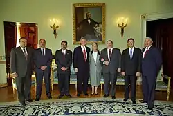 Chamorro retired from politics after her presidential term ended. In July 1997, she established a foundation bearing her name (Spanish: Fundación Violeta Barrios de Chamorro), which she chaired, intended to create development projects to strengthen peace initiatives; it ceased operations in Nicaragua in 2021 under pressure from Ortega, who returned to power in 2007.[114][12] She joined the Carter Center's Council of Presidents and Prime Ministers of the Americas Program, which works for co-operation and peace throughout the Americas.[15] Chamorro was also a member of the Inter-American Dialogue.[115]