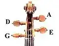 The tailpiece anchors the strings to the lower bout of the violin by means of the tailgut, which loops around an ebony button called the tailpin (sometimes confusingly called the endpin, like the cello's spike), which fits into a tapered hole in the bottom block. The E string will often have a fine tuning lever worked by a small screw turned by the fingers. Fine tuners may also be applied to the other strings, especially on a student instrument, and are sometimes built into the tailpiece. The fine tuners enable the performer to make small changes in the pitch of a string. At the scroll end, the strings wind around the wooden tuning pegs in the pegbox. The tuning pegs are tapered and fit into holes in the peg box. The tuning pegs are held in place by the friction of wood on wood. Strings may be made of metal or less commonly gut or gut wrapped in metal. Strings usually have a colored silk wrapping at both ends, for identification of the string (e.g., G string, D string, A string or E string) and to provide friction against the pegs. The tapered pegs allow friction to be increased or decreased by the player applying appropriate pressure along the axis of the peg while turning it.