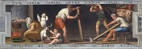 Virgil spent his boyhood in Cremona until his 15th year (55 BC), when he is said to have received the toga virilis on the very day Lucretius died.[26] From Cremona, he moved to Milan, and shortly afterwards to Rome.[26] After briefly considering a career in rhetoric and law, Virgil turned his talents to poetry.[27] Despite the biographers' statements that Virgil's family was of modest means, these accounts of his education, as well as of his ceremonial assumption of the toga virilis, suggest his father was a wealthy equestrian landowner.[28]