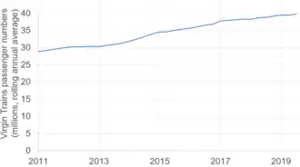 Virgin Trains West Coast passenger numbers in the previous year from 2011 to 2019.[56][57]