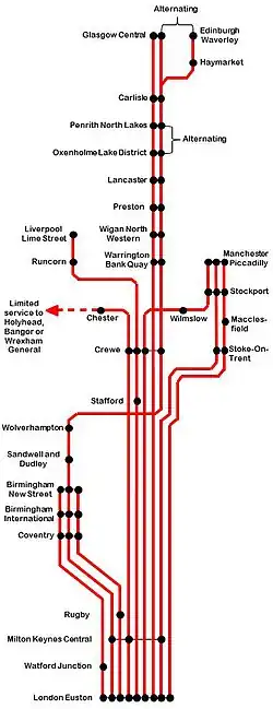 One of Virgin's franchise commitments was to replace the British Rail-era locomotives and rolling stock inherited by Virgin West Coast with brand new tilting trains.[7] It was expected that the Pendolinos would run at service speeds of up to 140 mph (225 km/h) and that the whole fleet would be delivered by May 2002.[8][9] In order for tilting trains to be operated, Railtrack had committed itself to upgrading the West Coast Main Line as to permit 140 mph operation by 2005. The line's modernisation was slowed by spiralling costs, rising from an estimated £2 billion to roughly £10 billion,[10] while the programme had failures that were technical as well as managerial, such as the moving block signalling apparatus being immature for such a busy mixed-traffic mainline.[11][12] Railtrack would ultimately collapse while its successor, Network Rail, would also be unable to fully deliver the promised upgrade, heavily impacting Virgin West Coast's operations.[13][14] The upgrade programme would be cut back: as a result, the top speed was reduced to 125 mph.[15]