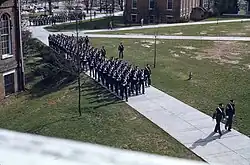VPI President T. Marshall Hahn, whose tenure ran from 1962 to 1974,[26] was responsible for many of the programs and policies that transformed VPI from a small, historically white, predominately male, military institute with a primary focus on undergraduate teaching into a major co-educational research university. The student body that had been approximately 5,682 in 1962 increased by roughly 1,000 students each year, new dormitories and academic buildings were constructed, faculty members were added – in 1966, for instance, more than 100 new professors joined the faculty – and research budgets were increased.[26] During Hahn's tenure, not only did the university graduate its first Rhodes Scholar, W.W. Lewis, Class of 1963,[27] the requirement for male students to participate in the Corps of Cadets for two years was dropped in 1964. Beginning in the fall of 1973, women could participate in the Corps, making Virginia Tech among the nation's first senior military colleges to integrate women.[28]