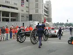 In a nod to this southern heritage the Confederate Battle Flag was traditionally waved by cheerleaders at Virginia Tech football games and the Highty-Tighties played Dixie as a fight song when the Hokies scored a touchdown. A large Confederate flag also hung inside Cassell Coliseum where Virginia Tech basketball games are played.[16] Since 1963, "Skipper", a replica of a Civil War cannon has been fired at football games by members of the Corps of Cadets when the team scores.[17] The Confederate Flag was also prominently featured on all Virginia Tech class rings.[18] The display of the Confederate flag at athletic events ended in the late 1960s after Marguerite Harper, a black woman attending Virginia Tech on a Rockefeller Scholarship for culturally disadvantaged students, was elected to the student senate during her sophomore year and made a successful resolution to end the practice. Following the resolution there was a large demonstration in opposition to the removal of the Confederate flag. The campus was covered in Confederate flags and "Dixie" was blasting from dormitory windows. Harper and her white roommate received hate mail and threatening phone calls, but the resolution stood, and the display of the rebel flag ended in 1969.[19] The Confederate flag on Virginia Tech class rings became optional in 1972 and could be left off of the ring at the student's request.[20] The Confederate flag has since been removed from class ring designs entirely.