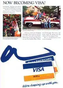 A 1976 ad promoting the change of name to "Visa". An early Visa card is shown in the ad, as well as the BankAmericard that it replaced.