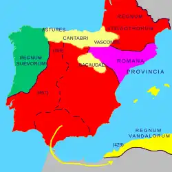 ![]() Extent of the Visigothic Kingdom, c. 500 (total extent shown in orange, territory lost after Battle of Vouillé shown in light orange: Kingdom of the Suebi was annexed in 585). | |||||||||||||||||