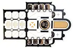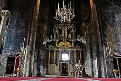 Because of the dimensions of the church, which by far surpass the size of all the other medieval Balkan churches, the monastery has been popularly named High Dečani.[35] The church has five-nave naos, a three-part iconostasis, and a three-nave parvise. With the dome, it is 26 m high. Its outer walls are done in alternate layers of white and pink marble. The portals, windows, consoles, and capitals are richly decorated. Christ the Judge is shown surrounded by angels in the western part of the church. Its twenty major cycles of fresco murals represent the largest preserved gallery of Serbian medieval art, featuring over 1000 compositions and several thousand portraits.