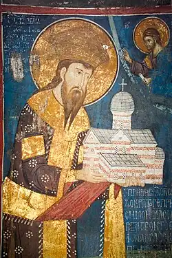 The construction of the monastery began during the reign of the Serbian King Stefan Dečanski, in 1327. The original founding charter from 1330, also known as the Dečani chrysobull, has been preserved to this day.[9] After his death in 1331, Stefan Dečanski was buried in the still unfinished monastery, the construction of which was continued by his son Stefan Dušan, who became the King of Serbia in the same year.[10] The main architect of the monastery was the Franciscan friar Vito of Kotor.[10][11] According to Bratislav Pantelić, the monastic church displays some features of Gothic architecture,[12] Byzantine-Romanesque architecture and contains Byzantine style fresco paintings and numerous Romanesque sculptures, part of a "Palaeologan renaissance".[13]