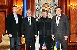 Klitschko formally began his political career in 2006 when he placed second in the Kyiv mayoral race. In 2010, he founded the party Ukrainian Democratic Alliance for Reform (UDAR) and was elected for this party the 2012 Ukrainian parliamentary election. He was a leading figure in the 2013–2014 Euromaidan protests, and he announced his possible candidacy for the Ukrainian presidency but later withdrew and endorsed the eventual winner Petro Poroshenko. He was elected Mayor of Kyiv on 25 May 2014.[25] He headed the election list of the winner of the 2014 Ukrainian parliamentary election, the Petro Poroshenko Bloc but gave up his parliamentary seat to stay on as mayor of Kyiv.[26][27][28] On 28 August 2015, the UDAR party merged into Petro Poroshenko Bloc,[8] and Klitschko became the new party leader.[8] Klitschko was reelected as mayor on 15 November 2015.[29] Klitschko revived UDAR, and left Petro Poroshenko Bloc with it, in May 2019 and simultaneously announced that UDAR would take part in the 2019 Ukrainian parliamentary election autonomously.[30] UDAR failed to win any seats.[31]
