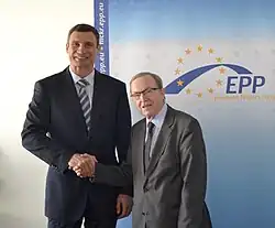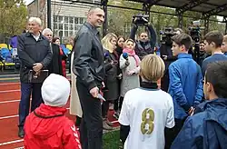 Klitschko is a former leader of the Petro Poroshenko Bloc,[3] and is a former member of the Ukrainian Parliament.[8][9][10][11][12][13][14] He became actively involved in Ukrainian politics in 2005 and combined this with his professional boxing career until his retirement from the sport in 2013.[10][15][16] He holds a Doctoral Degree (Ph.D.) in "Sports Science" from Kyiv University's Physical Science and Sports Department.[17]