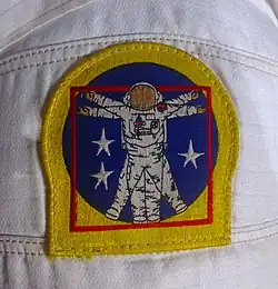 The Vitruvian Man depicts a nude man facing forward, surrounded by a square and a circle.[2] The man is portrayed in different stances simultaneously: an "X" pose and a "T" pose. For the former, his arms are stretched diagonally above his shoulders and his legs widely parted so that his feet and hands touch the edge of the circle centred on his navel. For the latter, his arms are outstretched horizonally and his legs are together, so that his hands, head and feet all touch the perimeter of the square.[2] The scholar Carlo Vecce notes that this approach displays multiple phases of movement at once, akin to a photograph.[10] The man's fingers and toes are arranged carefully as to not breach the surrounding shapes.[9] Commentators often note that Leonardo went out of his way to create an artistic depiction of the man, rather than a simple portrayal.[11][12] According to the biographer Walter Isaacson, the use of delicate lines, an intimate stare, and intricate hair curls, "weaves together the human and the divine".[11] Pedretti notes close similarities between the man and the angel of Leonardo's earlier Annunciation painting.[12]