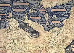 Fra Mauro's map, sector XXIX, showing Vlachia Piccola in Thessaly and Monte de Murlachi in Dalmatiac. 1450 CE