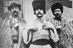 The term 'Vlach' first appeared in medieval sources and was generally used as an exonym for speakers of the Eastern Romance languages.[3] Although later associated with transhumance across most Southeastern Europe, the early medieval Vlachs were agriculturists and pastoralists, and the practice of transhumant pastoralism only took hold between the 14th and the 19th centuries.[23] Testimonies from the 13th and the 14th centuries show that, although in Europe and beyond, they were called Vlachs or Wallachians (oláh in Hungarian, Vláchoi (Βλάχοι) in Greek, Volóxi (Воло́хи) in Russian, Walachen in German, Valacchi in Italian, Valaques in French, Valacos in Spanish), the Romanians used the endonym rumân or român, from the Latin romānus, meaning 'Roman'.[1][24] Aromanians use the endonym armãn (pl.: armãni) or rãmãn (pl.: rãmãni), from romānus.[3] From Latin romānus are also the Albanian forms rëmen and rëmër, 'vlach'.[25] Megleno-Romanians designate themselves with the Macedonian form Vla (pl.: Vlaš) in their own language.[3]