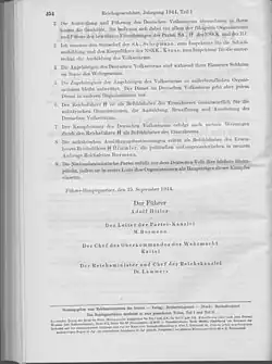 From the militia's inception until the spring of 1945, Himmler and Bormann engaged in a power-struggle over the jurisdictional control over the Volkssturm regarding security and police powers in Germany and the occupied territories; a contest which Himmler and the SS more or less won on one level (police and security), but lost to Bormann on another (mobilising reserve forces).[33] These disputes over jurisdiction only served to hinder centralized coordination of the Volkssturm, reducing its effectiveness in turn.[34] Historian David Yelton described the situation as two ranking officers at the helm of a sinking ship fighting over command.[35]