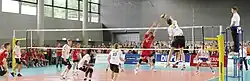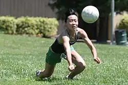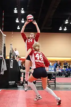 The complete set of rules is extensive,[2] but play essentially proceeds as follows: a player on one of the teams begins a 'rally' by serving the ball (tossing or releasing it and then hitting it with a hand or arm), from behind the back boundary line of the court, over the net, and into the receiving team's court.[3] The receiving team must not let the ball be grounded within their court. The team may touch the ball up to three times to return the ball to the other side of the court, but individual players may not touch the ball twice consecutively.[3] Typically, the first two touches are used to set up for an attack. An attack is an attempt to direct the ball back over the net in such a way that the team receiving the ball is unable to pass the ball and continue the rally, thus, losing the point. The team that wins the rally is awarded a point and serves the ball to start the next rally. A few of the most common faults include: