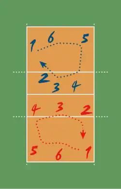 After a team gains the serve (also known as siding out), its members must rotate in a clockwise direction, with the player previously in area "2" moving to area "1" and so on, with the player from area "1" moving to area "6".[3] Each player rotates only one time after the team gains possession of the service; the next time each player rotates will be after the other team wins possession of the ball and loses the point.[22]