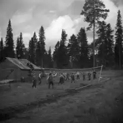 Volleyball is a team sport in which two teams of six players are separated by a net. Each team tries to score points by grounding a ball on the other team's court under organized rules.[1] It has been a part of the official program of the Summer Olympic Games since Tokyo 1964. Beach volleyball was introduced to the program at the Atlanta 1996 Summer Olympics. The adapted version of volleyball at the Summer Paralympic Games is sitting volleyball.