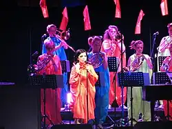 Björk went on an 18-month tour in support of the album, which was her first tour in four years.[91] On the tour, which was conducted on a month-on/month-off basis, Björk performed with fourteen musicians on stage. Björk's touring band for this tour consisted of drummer Chris Corsano, musician Mark Bell (who also accompanied Björk on the Homogenic tour), pianist Jónas Sen (who played celeste on the tracks Gratitude and Cetacea on the Drawing Restraint 9 soundtrack), musician Damian Taylor and a 10-piece female Icelandic brass section.[1][92][93] Björk had described the tour as "kind of primitive, raw, almost butch", in marked contrast to her 2001 tour for Vespertine.[94] At several of the concerts Björk had been joined on stage by some of the musicians who collaborated on the album (but who are not part of the touring band), including ANOHNI, Min Xiao-Fen and Toumani Diabaté. Björk has voiced her dislike of fans recording video or taking pictures with flash at her concerts using their mobile phones, stating that it affects her ability to perform.[94][95] The tour took Björk to countries that she has not played in for over a decade, including Mexico, Brazil, Israel, Australia and New Zealand. Live footage of two concerts in Paris and Reykjavík, as well as a session with the tour band at Olympic Studios, were released as part of the Voltaïc box set on 23 June 2009.