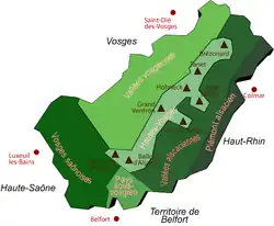 - The Higher Vosges or High Vosges[6] (Hautes Vosges), extending in the southern part of the range from Belfort to the river valley of the Bruche. The rounded summits of the Hautes Vosges are called ballons in French, literally "balloons".[7]