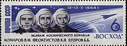 Voskhod 1 (Russian: Восход-1, lit. 'Sunrise-1') was the seventh crewed Soviet space flight. Flown by cosmonauts Vladimir Komarov, Konstantin Feoktistov, and Boris Yegorov, it launched 12 October 1964, and returned on the 13th. Voskhod 1 was the first human spaceflight to carry more than one crewman into orbit, the first flight without the use of spacesuits, and the first to carry either an engineer or a physician into outer space. It also set a crewed spacecraft altitude record of 336 km (209 mi).[3]