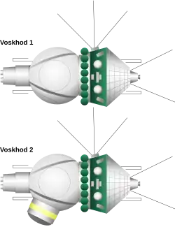 The Voskhod programme (Russian: Восход, lit. 'ascent, dawn', IPA: [vɐsˈxot]) was the second Soviet human spaceflight project. Two one-day crewed missions were flown using the Voskhod spacecraft and rocket, one in 1964 and one in 1965, and two dogs flew on a 22-day mission in 1966.