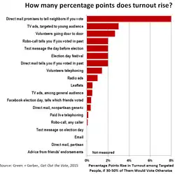 A 2017 experimental study found that by sending registered voters between the ages of 18 and 30 a voter guide containing salient information about candidates in an upcoming election (a list of candidate endorsements and the candidates' policy positions on five issues in the campaign) increased turnout by 0.9 points.[53] Voting advice applications have strong evidence to increase voter turnout and vote choice and moderate evidence to increase voting knowledge.[54]