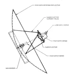 The 3.7 m (12 ft) diameter high gain dish antenna used on the Voyager craft