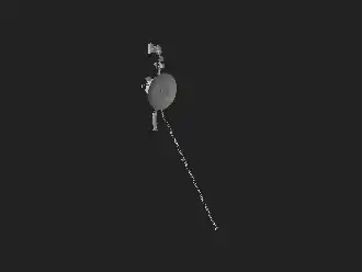 The Voyager Golden Record is attached to one of the bus sides. The angled square panel to the right is the optical calibration target and excess heat radiator. The three radioisotope thermoelectric generators (RTGs) are mounted end-to-end on the lower boom.