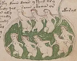 • Astronomical, 17 pages: Contains circular diagrams suggestive of astronomy or astrology, some of them with suns, moons, and stars. One series of 12 diagrams depicts conventional symbols for the zodiacal constellations (two fish for Pisces, a bull for Taurus, a hunter with crossbow for Sagittarius, etc.). Each of these has 30 female figures arranged in two or more concentric bands. Most of the females are at least partly nude, and each holds what appears to be a labelled star or is shown with the star attached to either arm by what could be a tether or cord of some kind. The last two pages of this section were lost (Aquarius and Capricornus, roughly February and January), while Aries and Taurus are split into four paired diagrams with 15 women and 15 stars each. Some of these diagrams are on fold-out pages.[12][54]