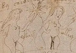 • f66r: A small number of words in the bottom left corner near a drawing of a nude man have been read as der Mussteil, a High German[17] phrase for 'a widow's share'.
