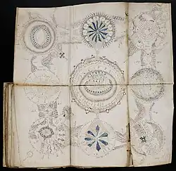 The first confirmed owner was Georg Baresch, a 17th-century alchemist from Prague.[9][19][20] The manuscript is named after Wilfrid Voynich, a Polish book dealer who purchased it in 1912.[21] The manuscript consists of around 240 pages, but there is evidence that some of the pages are missing. The text is written from left to right, and some pages are foldable sheets of varying sizes. Most of the pages have fantastical illustrations and diagrams, some crudely coloured, with sections of the manuscript showing people, unidentified plants and astrological symbols. Since 1969, it has been held in Yale University's Beinecke Rare Book and Manuscript Library.[22][12][23] In 2020, Yale University published the manuscript online in its entirety in their digital library.[24]