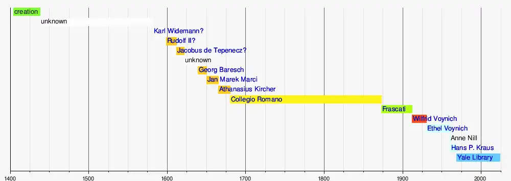 The first confirmed owner was Georg Baresch, a 17th-century alchemist from Prague. Baresch was apparently puzzled about this "Sphynx" that had been "taking up space uselessly in his library" for many years.[9] He learned that Jesuit scholar Athanasius Kircher from the Collegio Romano had published a Coptic (Egyptian) dictionary and claimed to have deciphered the Egyptian hieroglyphs; Baresch twice sent a sample copy of the script to Kircher in Rome, asking for clues. The 1639 letter from Baresch to Kircher is the earliest known mention of the manuscript to have been confirmed.[16]