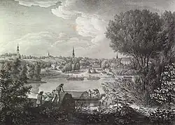 Vukovar was mentioned first in the 13th century as Volko, Walk, Wolkov, Wolcou, Walkov and numerous other versions (original Croatian/Slavic name of the town was Vukovo). All these different forms of the city's name were used until the 14th century, when the name Vukovar began to be used more and more, to which the Hungarian suffix -var was added, which denotes a fortress.[17] In 1231, Vukovo obtained its first privileges and later the right to levy taxes on passages along the Danube and the Vuka.[18] In 1231, Vukovar received the status of a royal free city. Duke Koloman gave Vukovar the status of a free royal city, to encourage further development of the city. His charter meant that the residents of Vukovar were directly subject to the king, not the landowner.[17] The charter of Duke Koloman confirmed the privileges that protected the people of Vukovar.[15] From the contents of the charter, it can be seen that at that moment, an ethnically diverse population was already living in Vukovar. The inhabitants of Vukovar were engaged in trade and crafts. Vukovo County was quite densely populated in the Middle Ages. Vukovar entered the Middle Ages as a suburb with roads, and then a fortress was built. The royal administration is important for the further development of the city. The citizens of Vukovar received privileges from King Ludovik of Anjou, which included the holding of weekly fairs, which led to further stronger economic growth. Due to trade levies, the city's income also increases. The county was densely populated, and according to written sources, it had 33 forts, 34 shops and 1,182 villages, settlements and inhabited estates. Vukovar was an important church seat and a fortified city. The city occupied between 20 and 25 hectares (49 and 62 acres) of the city area. At the end of the 14th century, Vukovar was one of the largest medieval Slavonic towns with 350 houses and 2,000 to 2,500 inhabitants.[17] During administration of the medieval Kingdom of Hungary, the town was a seat of Valkó (Croatian: Vuka) county, which was located between the Drava and Sava rivers, while during Ottoman administration it was part of the Sanjak of Syrmia. The Turkish rule brought great changes to the Vukovar region. On their campaign in 1526, the Turks occupied Ilok and Vukovar. Vukovar lost its significance, but still remained an important trade center on an important trade route. Before liberation from the Turks, Vukovar had close to 3,000 inhabitants.[15]