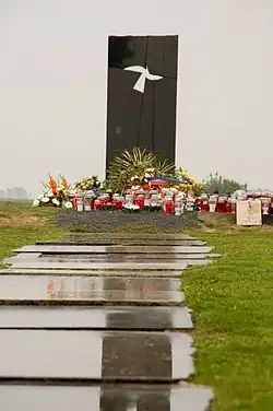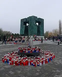 During World War II the city was bombed by the Allies. The first Yugoslav Partisans uprising in the district (kotar) of Vukovar happened on 26 August 1941, in the village of Bobota with subsequent continued dominant role of ethnic Serbs in the uprising who will constitute 75% of Yugoslav Partisans in the area as of late 1943.[35] Today, Dudik Memorial Park commemorates 455 individuals who were executed by the authorities of the Independent State of Croatia during the World War II in Yugoslavia.[36] The monument at the Dudik Memorial Park, built from 1978 to 1980, is designed by Bogdan Bogdanović, for which he won the International Piranesi Award.[37] At least 1,027 soldiers of the Bulgarian Armed Forces who fought on Syrmian Front died during the liberation of Vukovar and related fights and are today commemorated at the local Bulgarian Military Cemetery.[38] An additional monument was erected in Borovo Naselje to commemorate the soldiers of the Yugoslav and the Soviet Red Army who lost their lives in the liberation of the region between 8 and 12 April 1944.[39] The monument was built by workers from the Borovo factory.[39] Vukovar's memorial ossuary contains the remains of 388 victims transferred from the Dudik memorial area, including 155 soldiers from the Fifth Vojvodina Strike Brigade and 62 Red Army soldiers.[39] In 2008 an unexploded bomb was found in the city from this period.[40]