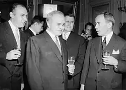 Molotov accompanied Stalin to the Teheran Conference in 1943,[64] the Yalta Conference in 1945,[65] and, after the defeat of Germany, the Potsdam Conference.[66] He represented the Soviet Union at the San Francisco Conference, which created the United Nations.[67] In April 1945, shortly after the death of Franklin D. Roosevelt, Molotov engaged in talks with the new American President Harry S. Truman; these talks, despite not being hostile, came to be mythologised decades later as an early crack in US-Soviet relations harbingering the beginning of the Cold War.[68] Even during the wartime alliance, Molotov was known as a tough negotiator and a determined defender of Soviet interests. Molotov lost his position of First Deputy chairman on 19 March 1946, after the Council of People's Commissars had been reformed as the Council of Ministers.