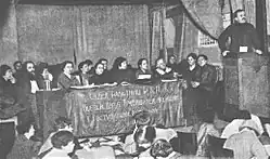 Molotov became a member of the Bolshevik Party's committee in Petrograd in 1916. When the February Revolution occurred in 1917, he was one of the few Bolsheviks of any standing in the capital. Under his direction, Pravda took to the "left" to oppose the Provisional Government formed after the revolution. When Joseph Stalin returned to the capital, he reversed Molotov's line,[5] but when Lenin arrived, he overruled Stalin. However, Molotov became a protégé of and a close adherent to Stalin, an alliance to which he owed his later prominence.[6] Molotov became a member of the Military Revolutionary Committee, which planned the October Revolution and effectively brought the Bolsheviks to power.[7]