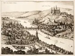 Panorama of Würzburg with castle Marienberg. Matthäus Merian in Cornelis Danckerts, "Historis", 1642.