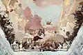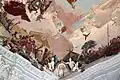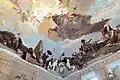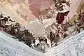 Under the rule of Prince-Bishop Anselm Franz von Ingelheim (1746–1749), all building work on the Residence ceased once again.[3] After his death, once Karl Philipp von Greifenclau zu Vollraths (1749–1754) became Prince-Bishop, he ordered a resumption of construction. In the same year, Antonio Bossi completed the stucco-work in the Garden Hall, the painting of which was finished in the next year. In 1750, Lorenz Jakob Mehling, a merchant at Venice, sent Giovanni Battista Tiepolo, the most famous fresco painter of his time, to the episcopal residence, after the painter Giuseppe Visconti had failed.[4] Giovanni Battista Tiepolo, assisted by his sons, decorated the Imperial Hall and the ceiling above the staircase with frescoes in the early 1750s. The enormous staircase is vaulted by the largest continuous ceiling fresco in the world (approx. 580 m²), painted between 1752 and 1753 by Giovanni Battista Tiepolo as well as his sons − especially Giovanni Domenico Tiepolo − and other helpers. In 1753, Balthasar Neumann died.[3]