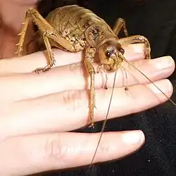 Wētā (also spelled weta in English) is the common name for a group of about 100 insect species in the families Anostostomatidae and Rhaphidophoridae endemic to New Zealand. They are giant flightless crickets, and some are among the heaviest insects in the world. Generally nocturnal, most small species are carnivores and scavengers while the larger species are herbivorous.[1] Although some endemic birds (and tuatara) likely prey on them, wētā are disproportionately preyed upon by introduced mammals, and some species are now critically endangered.