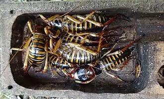Tree wētā (Hemideina) are commonly encountered in suburban settings in New Zealand's North Island. They are up to 40 mm long and most commonly live in holes in trees formed by beetle and moth larvae[28] or where rot has set in after a twig has broken off. The hole, called a gallery, is maintained by the wētā and any growth of the bark surrounding the opening is chewed away. They readily occupy a preformed gallery in a piece of wood (a "wētā motel") and can be kept in a suburban garden as pets. A gallery might house a harem of up to 10 adult females and one male.[12] Tree wētā are nocturnal. Their diet consists of plants and small insects.[8] The males have much larger jaws than the females, though both sexes will stridulate and bite when threatened.[15]