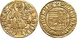 The general animosity towards the Habsburg dynasty and the impending Ottoman threat prevented the Hungarians from accepting an infant as king and turned to Poland.[44] Ladislaus' widowed mother, Queen Elizabeth of Luxembourg, was desperate to halt that and sent intermediaries to persuade the Hungarians to terminate all negotiations with Władysław.[46] Contrary to her efforts, the Hungarian nobles proved resolute and elected Władysław king on 8 March 1440.[48] Prior to his election, Władysław vowed to marry Elizabeth and protect her infant son's interests in Austria and Bohemia.[48] Simultaneously, Władysław was made King of Croatia as the Croatian dominion was in a personal union with Hungary since 1102.[49]