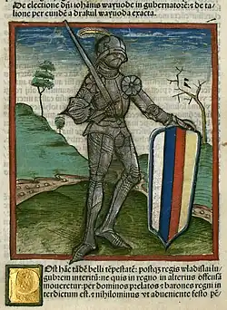 John Hunyadi, who supported Władysław's claim to the Hungarian throne and aided him militarily. Depiction from the Chronica Hungarorum, 1488.