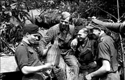 The Waffen-SS (German: [ˈvafn̩ʔɛsˌʔɛs]; lit.'Armed SS') was the combat branch of the Nazi Party's paramilitary Schutzstaffel (SS) organisation. Its formations included men from Nazi Germany, along with volunteers and conscripts from both German-occupied Europe and unoccupied lands.[11] With the start of World War II, tactical control was exercised by the Oberkommando der Wehrmacht (OKW, "High Command of the Armed Forces"),[12] with some units being subordinated to the Kommandostab Reichsführer-SS (lit.'Command Staff Reich Leader-SS') directly under Reichsführer-SS Heinrich Himmler's control.[13] It was disbanded in May 1945.