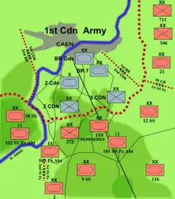 After the Dutch surrender, the Leibstandarte moved south to France on 24 May. Becoming part of the XIX Panzer Corps under the command of General Heinz Guderian, they took up a position 15 miles south west of Dunkirk along the line of the Aa Canal, facing the Allied defensive line near Watten.[69] A patrol from the SS-VT Division crossed the canal at Saint-Venant, but was destroyed by British armour. A larger force from the SS-VT Division then crossed the canal and formed a bridgehead at Saint-Venant; 30 miles from Dunkirk.[69] That night the OKW ordered the advance to halt, with the British Expeditionary Force trapped. The Leibstandarte paused for the night. However, on the following day, in defiance of Hitler's orders, Dietrich ordered his 3rd Battalion to cross the canal and take the heights beyond, where British artillery observers were putting the regiment at risk. They assaulted the heights and drove the observers off. Instead of being censured for his act of defiance, Dietrich was awarded the Knight's Cross of the Iron Cross.[71] On that same day, British forces attacked Saint-Venant, forcing the SS-VT Division to retreat.[69]