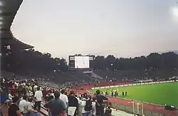 The Waldstadion's first major national event was the final of the German football championship on June 7, 1925. 1. FC Nürnberg defeated local club FSV Frankfurt 1:0. Between 24 and 28 July 1925, the Waldstadion hosted the 1925 Workers' Summer Olympiad.[10] The football final between Germany and Finland was played in front of a crowd of 40,000 spectators.[11] In 1937, the spectator capacity through expansion of the back straight was increased to 55,000.