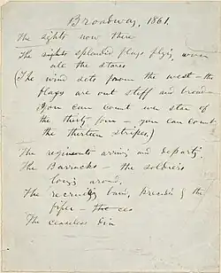 Whitman claimed that after years of competing for "the usual rewards", he determined to become a poet.[51] He first experimented with a variety of popular literary genres that appealed to the cultural tastes of the period.[52] As early as 1850, he began writing what would become Leaves of Grass,[53] a collection of poetry that he would continue editing and revising until his death.[54] Whitman intended to write a distinctly American epic[55] and used free verse with a cadence based on the Bible.[56] At the end of June 1855, Whitman surprised his brothers with the already-printed first edition of Leaves of Grass. George "didn't think it worth reading".[57]