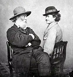 Another possible lover was Bill Duckett. As a teenager, he lived on the same street in Camden and moved in with Whitman, living with him a number of years and serving him in various roles. Duckett was 15 when Whitman bought his house at 328 Mickle Street. From at least 1880, Duckett and his grandmother, Lydia Watson, were boarders, subletting space from another family at 334 Mickle Street. Because of this proximity, Duckett and Whitman met as neighbors. Their relationship was close, the youth sharing Whitman's money when he had it. Whitman described their friendship as "thick". Some biographers describe Duckett as a boarder; others identify him as a lover.[169] Their photograph together is described as "modeled on the conventions of a marriage portrait", part of a series of portraits of the poet with his young male friends, and encrypting male–male desire.[170] Another young man with whom Whitman had an intense relationship was Harry Stafford, with whose family Whitman stayed when at Timber Creek, and whom he first met in 1876, when Stafford was 18. Whitman gave Stafford a ring, which was returned and re-given over the course of a stormy relationship lasting several years. Of that ring, Stafford wrote to Whitman: "You know when you put it on there was but one thing to part it from me, and that was death."[171]