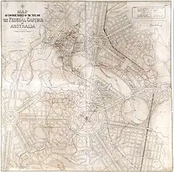 In 1913, Griffin was invited by the Commonwealth Government to Australia to inspect the site that was to become Canberra.[7][8] He left Mahony Griffin in charge of the practice and travelled to Australia in July. His letters reveal his appreciation for the Australian landscape. The Griffins joined the Naturalists Society of New South Wales in 1914, where they enjoyed organized bush walks and field studies. The society facilitated their contact with the Australian scientific community, especially botanists. This appreciation for Australian flora was reflected in Griffin's 1914 town plan for the town of Leeton in the Murrumbidgee Irrigation Area of New South Wales, and later in a design for Newman College at the University of Melbourne.[9] He also used Australian flora botanical names as places names for suburbs and streets in Canberra, such as Grevillea Park, Telopea Park, Clienthus Circle and Blandfordia.[10]